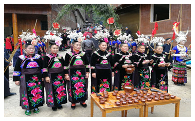 Highlights in Qiandongnan : Ethnic minorities in Qiandongnan have a population of 3,640,000, over eighty percent of the prefecture's total population. Miao and Dong minorities are the biggest groups. The colorful traditional festivals and local folk customs are the highlights of the prefecture. Road-block drinking is the first ritual when the hospitable Miao people welcome guests. From the foot to the gate of the village, there are usually twelve barriers with full dressed Miao youths pledging wine to visitors.